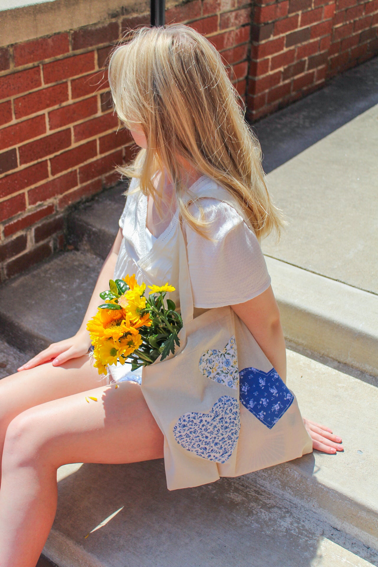 Sweet, sturdy, and full of charmโthis tote features a cozy blue patchwork panel accented with three heart appliquรฉs for the perfect cottagecore touch. Roomy enough for everyday errands and cute enough for coffee dates, itโs your new grab-and-go favorite.
