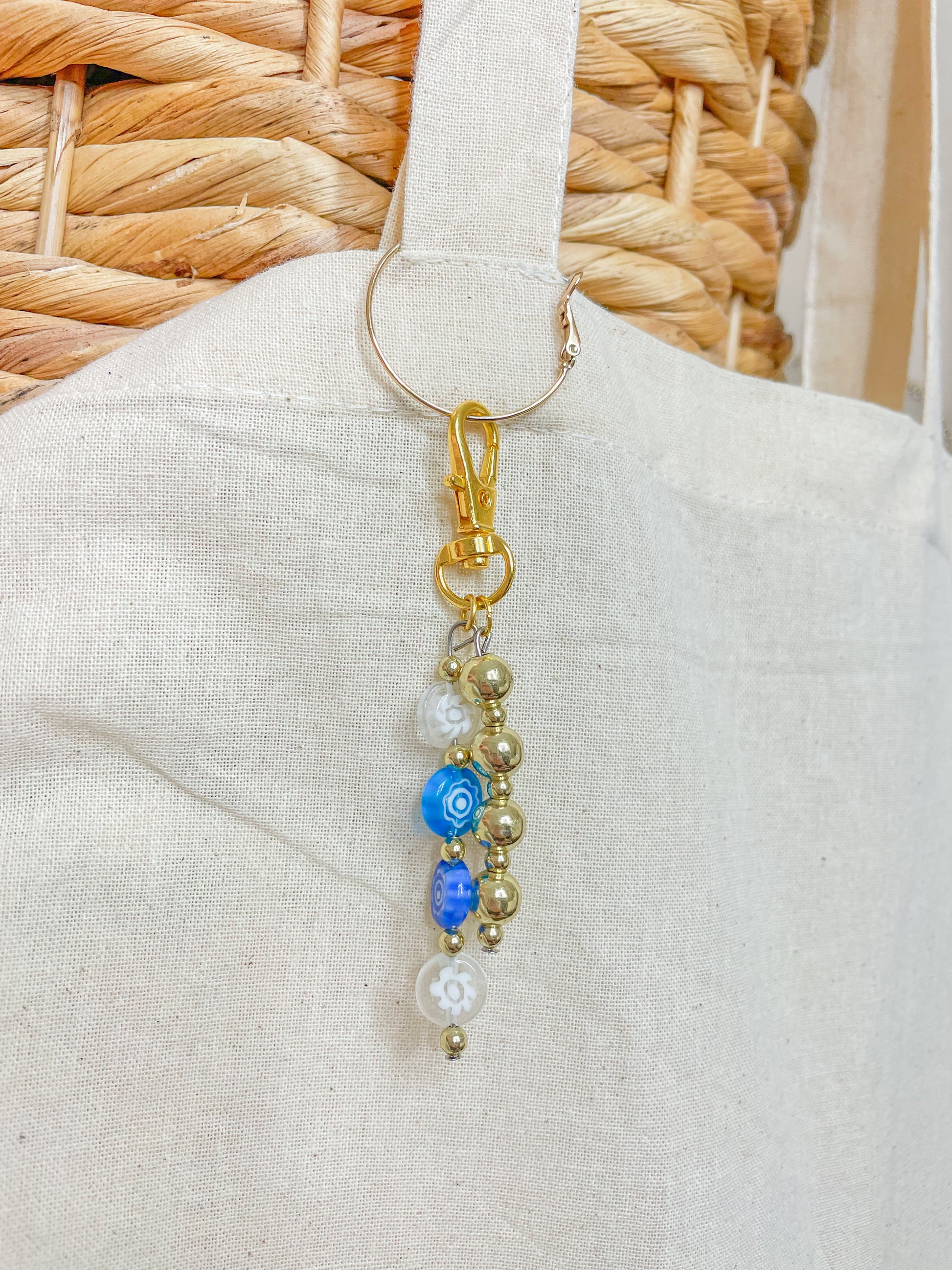 Elevate your everyday carry with this chic handmade bag charm. Featuring delicate blue and white millefiori glass beads paired with luxe gold accents, it’s the perfect blend of playful and polished. Clip it onto your tote, purse, or backpack to add a pop of color and a touch of elegance to your look.