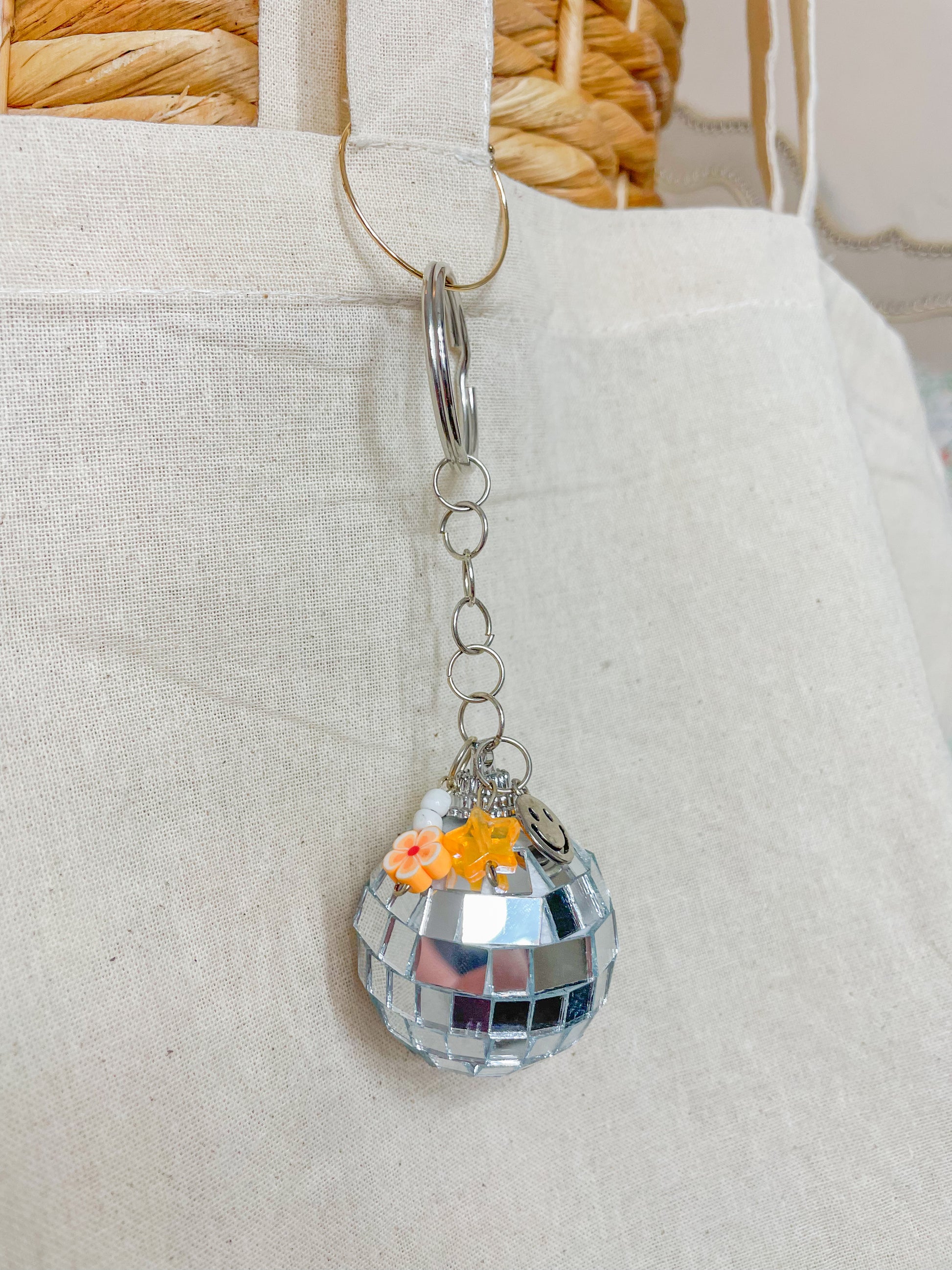 Bring retro sparkle and a pop of citrus to your everyday carry! This playful bag charm pairs a shiny mini disco ball with tiny orange charms for a fun, sunny vibe. Clip it to your tote, purse, backpack, or keys for instant shimmer and cheer.