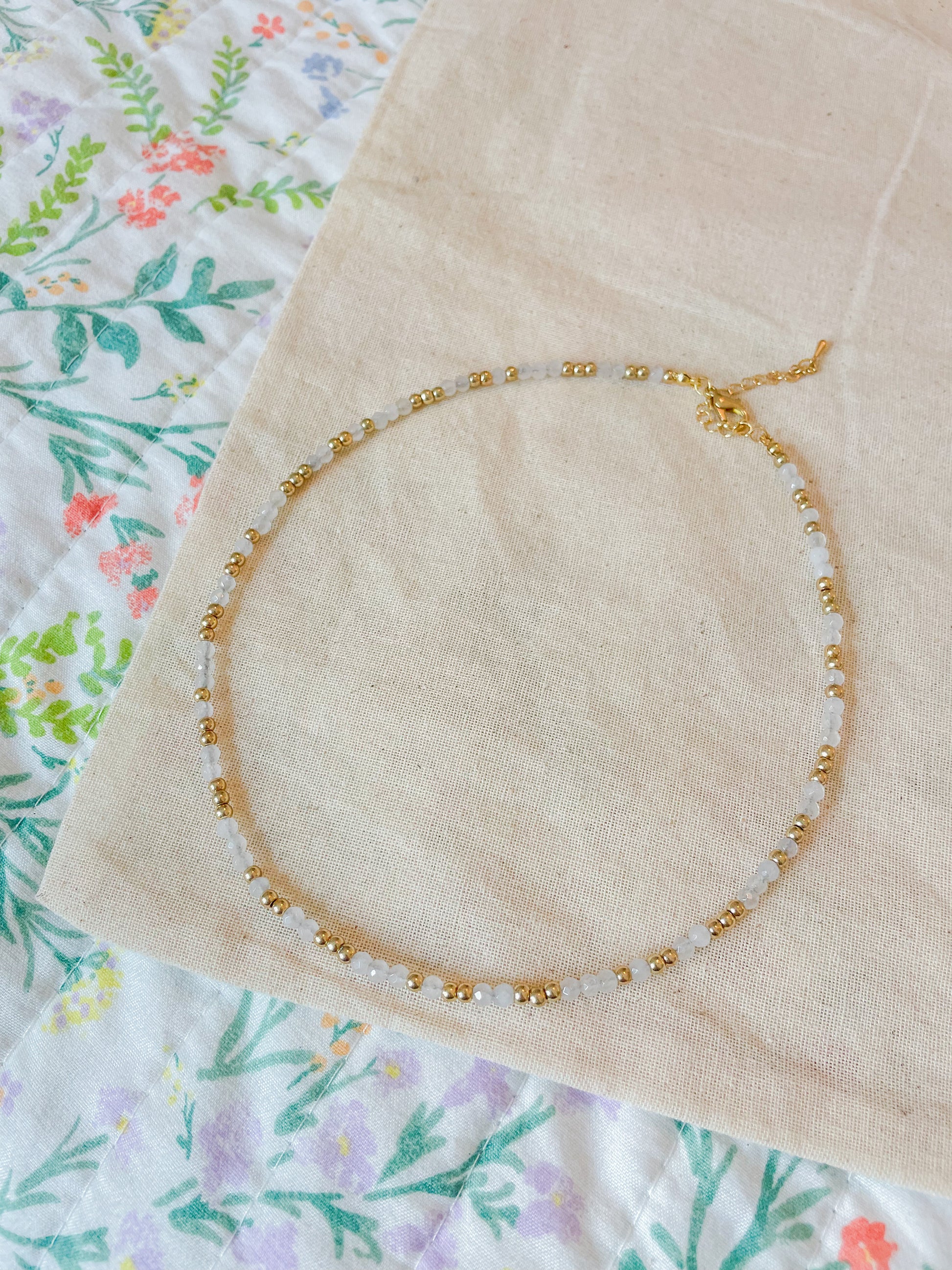 Delicate and luminous, this choker is designed to add effortless sparkle to your everyday look. Hand-strung with shimmering clear crystals and accented with tiny gold beads, it’s the perfect balance of minimal and elegant. Whether worn solo for a subtle shine or layered with your favorite necklaces, this piece is versatile enough for any occasion.