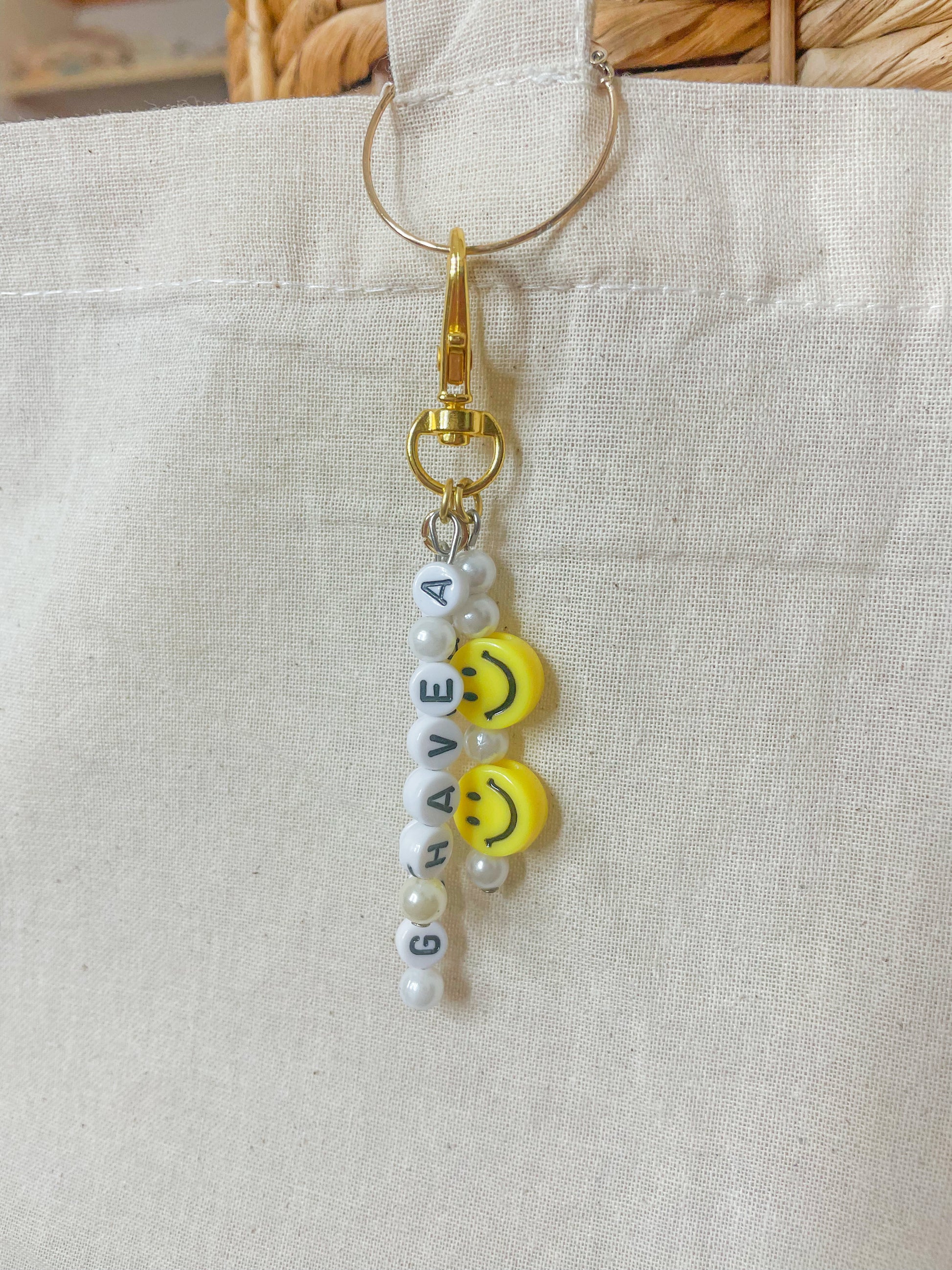 Brighten your bag — and your day — with our Have a Good Day Beaded Bag Charm. This adorable charm features cheerful smiley face beads, glossy faux pearls, and letter beads that spell out “Have a Good Day” for the perfect pop of positivity.
