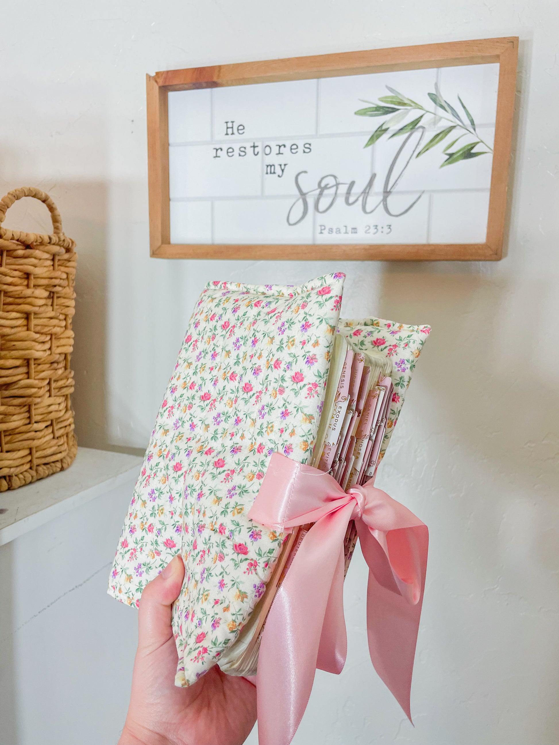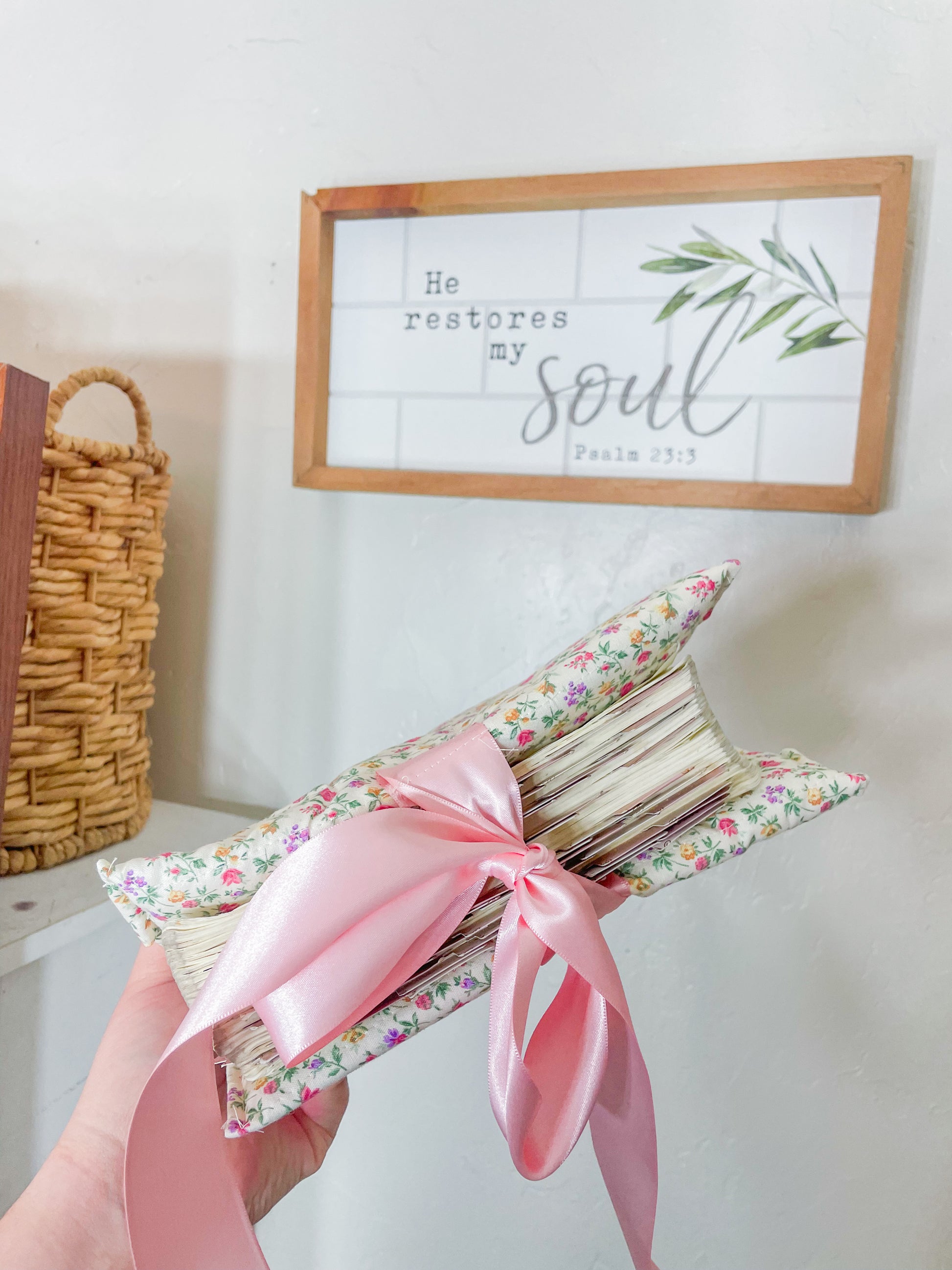Quilted Bible Verse Cover – Pink Ditsy Floral Fabric with Ribbon Closure