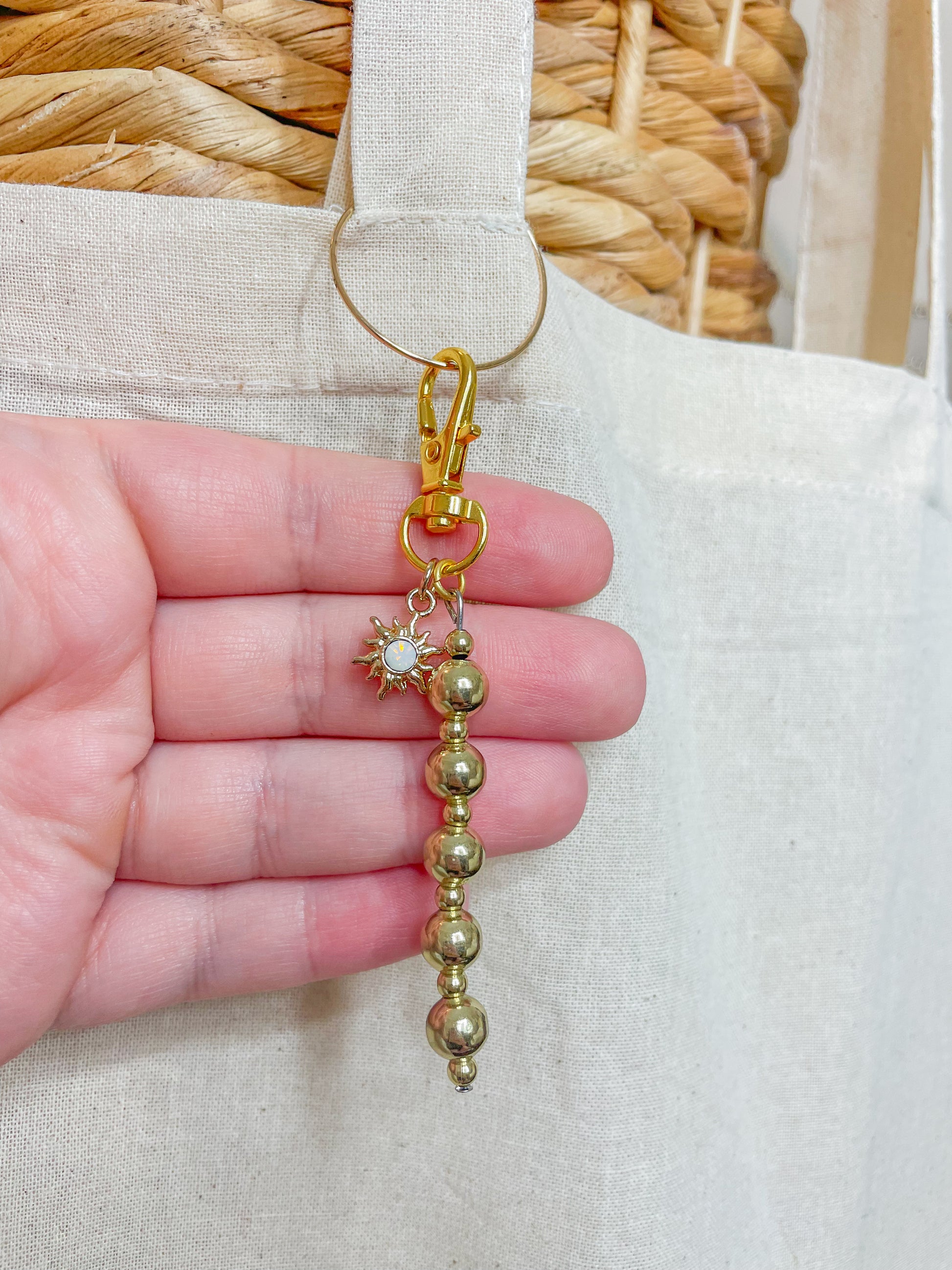 Shiny, simple, and totally celestial—this handmade bag charm pairs gleaming gold beads with a sweet star charm for a little sparkle wherever you clip it. Add it to your tote, purse, backpack, or keys for instant glow.