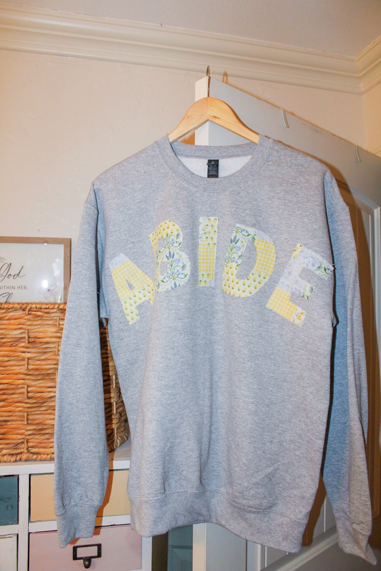 Stay rooted in comfort and faith with this handmade patchwork crewneck. Featuring warm yellow tones and stitched with the word “Abide” as a daily reminder of John 15:4, this sweatshirt blends cozy cottagecore charm with a meaningful message. With its relaxed fit and soft fabric, it’s perfect for layering on cool days, Bible study nights, or simply carrying encouragement wherever you go.